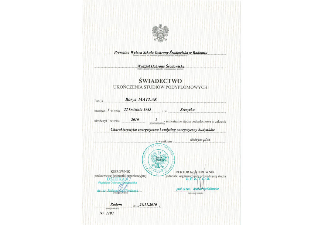 Po ukończeniu studiów kontynuowałem naukę w Katowicach, podejmując dwa kierunki studiów podyplomowych: z zakresu pośrednictwa, wyceny i zarządzania nieruchomościami oraz auditingu energetycznego. Uzupełnieniem tej ścieżki był kurs deweloperski, który poza teoretyczną wiedzą dostarczył mi przede wszystkim praktycznych doświadczeń związanych z realizacją inwestycji – od inwestorstwa zastępczego po mechanizmy wykorzystania funduszy unijnych. W tym obszarze odbyłem również specjalistyczne szkolenie dotyczące pozyskiwania środków zewnętrznych – szczególnie na cele termomodernizacyjne we współpracy ze wspólnotami mieszkaniowymi.