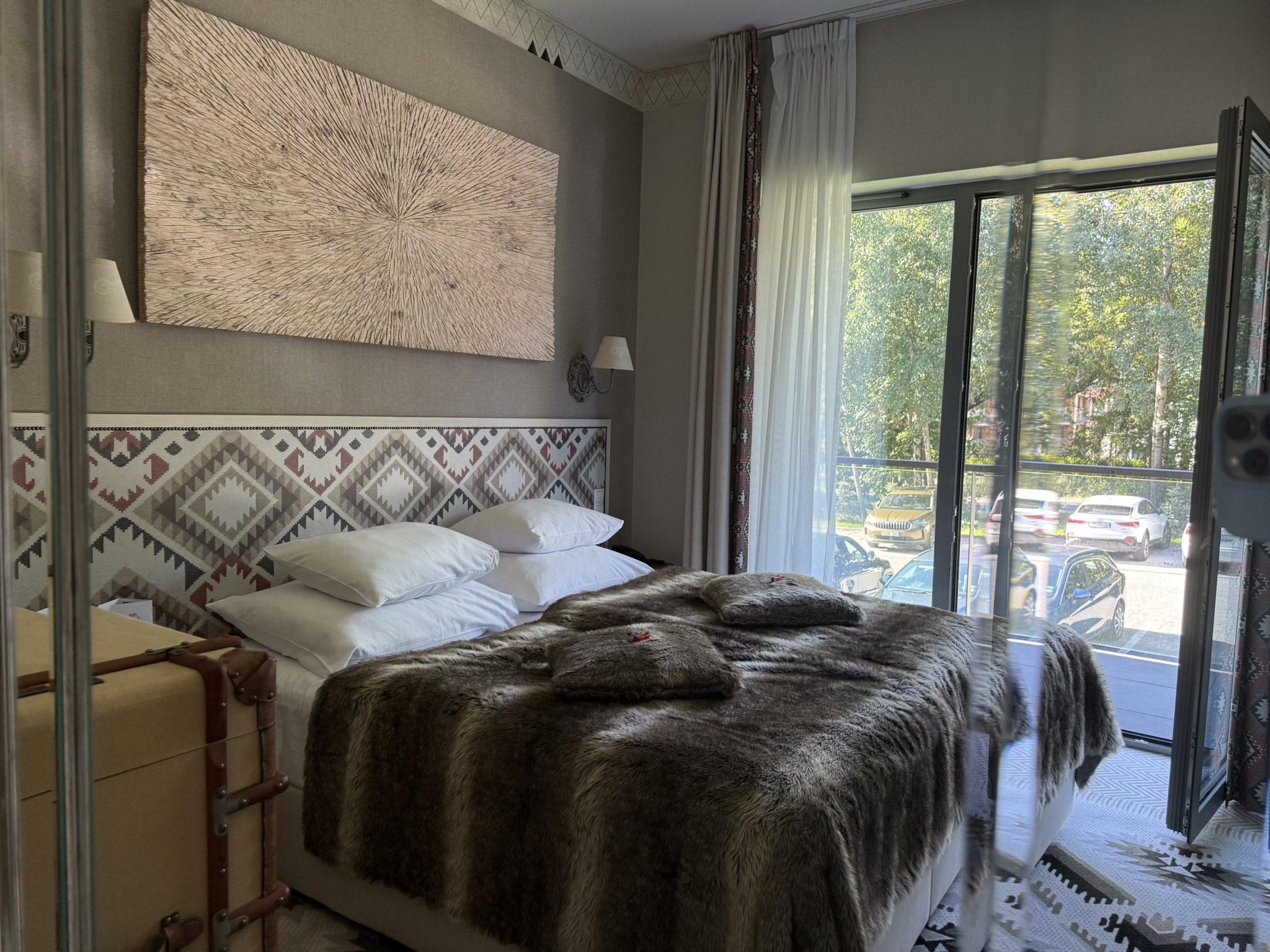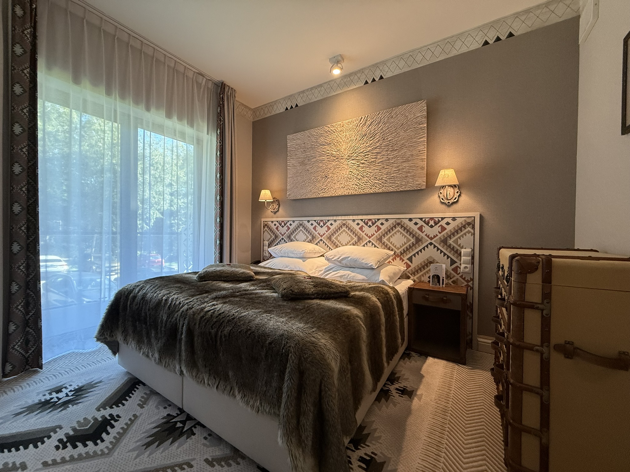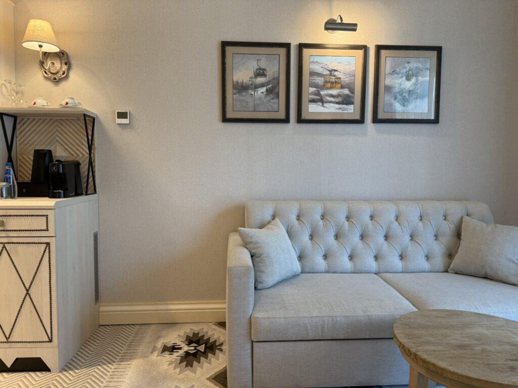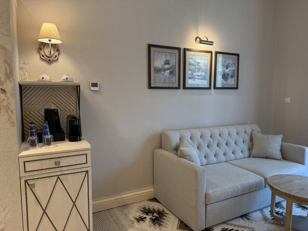 Lokal jest w pełni umeblowany i wykończony w wysokim standardzie hotelowym, spójnym i eleganckim, górskim stylem całego kompleksu. Komfortowa przestrzeń dwóch pokoi , łazienki oraz balkonu dokładnie składa się z: