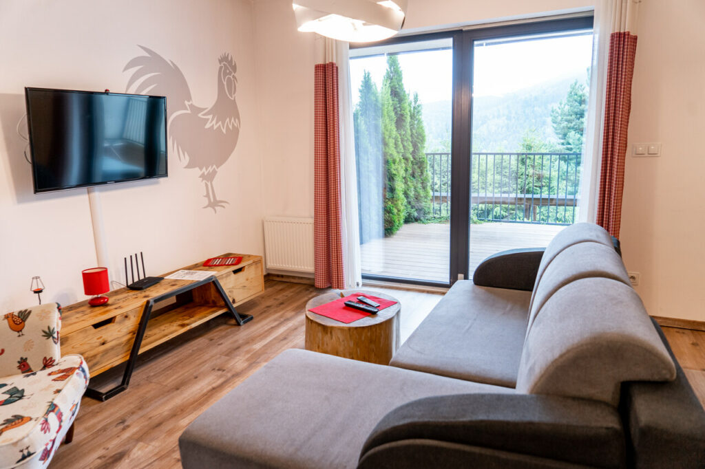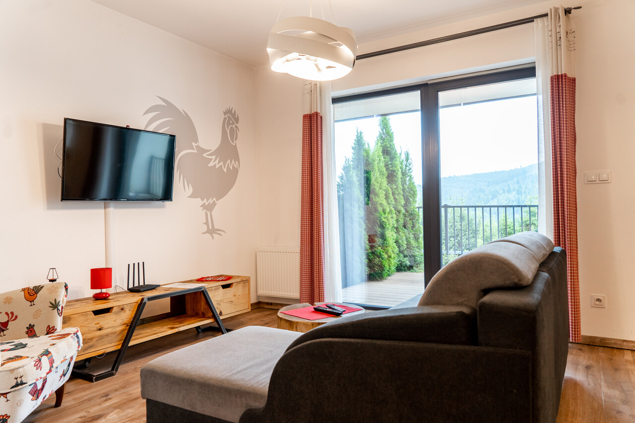 Ogromnym atutem apartamentu jest duży taras o powierzchni ok. 20m2. Z tarasu rozpościera się niepowtarzalny widok na góry i jezioro żywieckie. Apartamentowiec znajduje się na zboczu góry, dzięki czemu można podziwiać górską panoramę. Budynek został oddany do użytkowania w 2016 roku. Do apartamentu wliczone jest miejsce postojowe.
