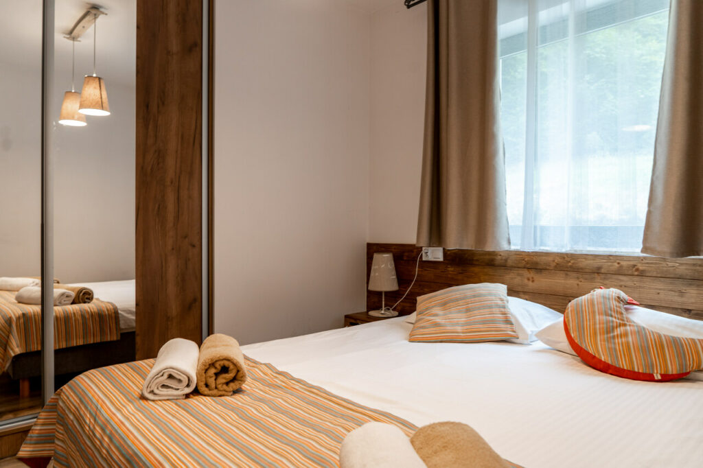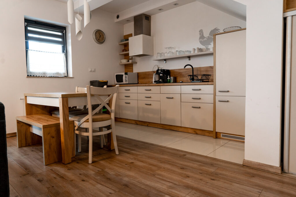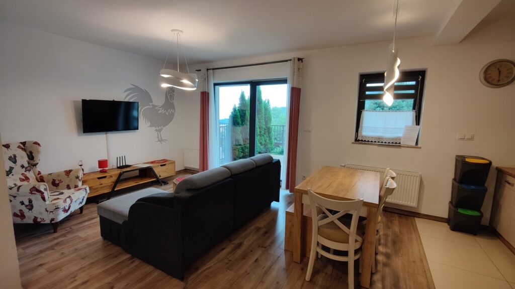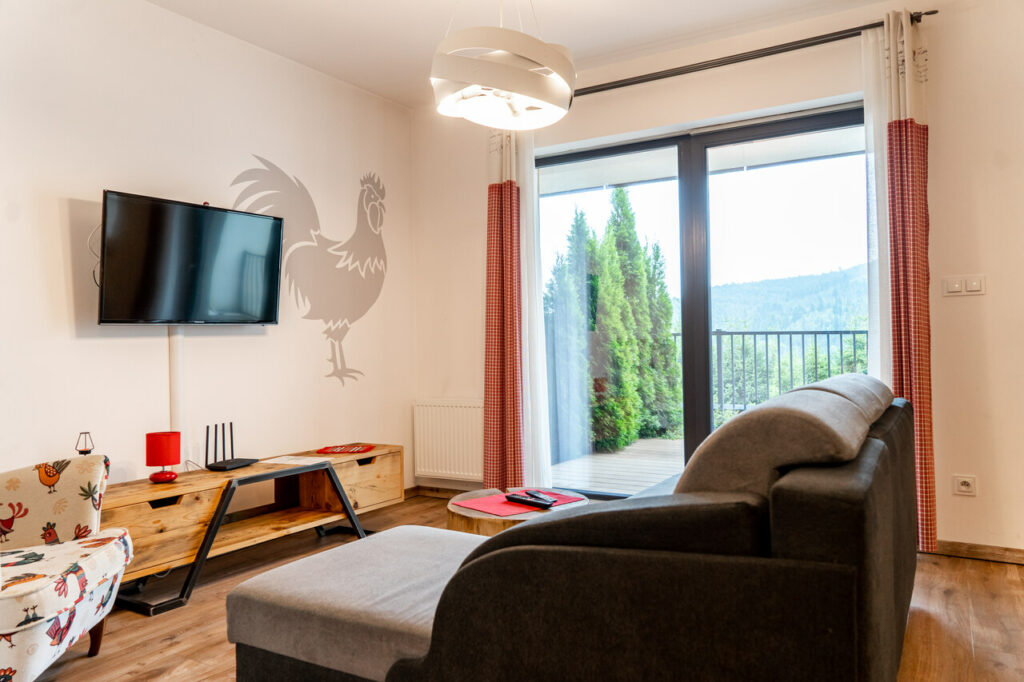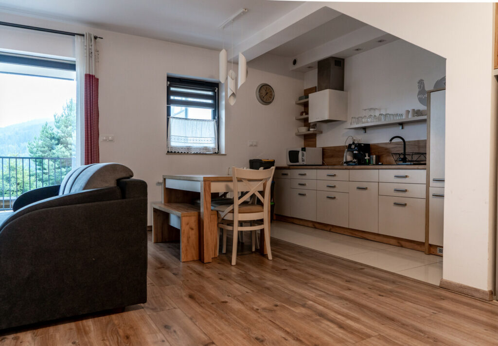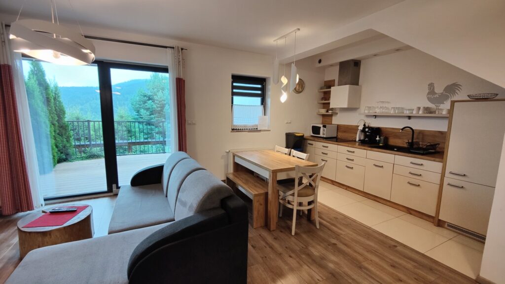 Apartament w Szczyrku z widokiem na góry i jezioro. Chcesz wypoczywać w jednym z najpiękniejszych miejsc w Polsce? Chcesz, aby Twój apartament był idealny na wynajem krótkoterminowy? W takim razie ten apartament jest dla Ciebie! Lokal o powierzchni 44,23m2 znajduje się w pobliżu lasu w bardzo spokojnej okolicy Szczyrku. Składający się z dwóch pokoi, pokoju dziennego z aneksem kuchennym, sypialni oraz tarasu. Wnętrze apartamentu jest urządzone w stonowanych kolorach i utrzymane w minimalistycznym stylu. Duże przeszklenia zapewniają mnóstwo naturalnego światła, a przestronne wnętrza gwarantują swobodę i komfort. Wyposażenie obejmuje między innymi: wygodne łóżko, rozkładaną sofa, w pełni wyposażoną kuchnię, łazienkę z prysznicem, duży telewizor, dostęp do Wi-Fi. Apartament znajduje się w nowoczesnym kompleksie zapewniający swoim gościom strefę relaksu, saunę suchą, wannę jacuzzi, strefę kids.